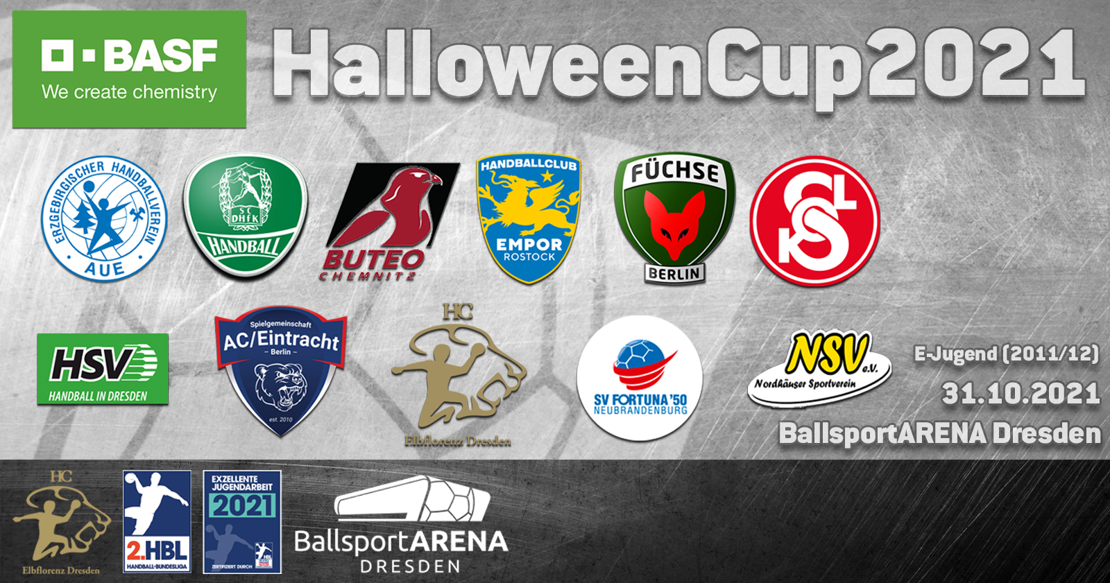 Der BASF-HalloweenCup stellt im Turnierkalender einiger Nachwuchsmannschaften ein besonderes Highlight dar und soll auch dieses Jahr wieder entsprechend gelebt werden. Mit 12 Mannschaften ist es Organisator Max Domaschke wieder gelungen, ein breites Teilnehmerfeld aus vielen Teilen Deutschlands in die BallsportARENA Dresden einzuladen. Wir begrüßen dieses Jahr folgende Mannschaften: HC Empor Rostock (2x), Füchse Berlin, NSG EHV/NH Aue, SC DHfK Leipzig, HC Buteo Chemnitz, Sokol Vrosice, SG AC/Eintracht Berlin, SV Fortuna ’50 Neubrandenburg, HSV Dresden und den Nordhäuser SV. Schön, dass ihr auch dieses Jahr dabei seid, beziehungsweise erstmals am Turnier teilnehmt.